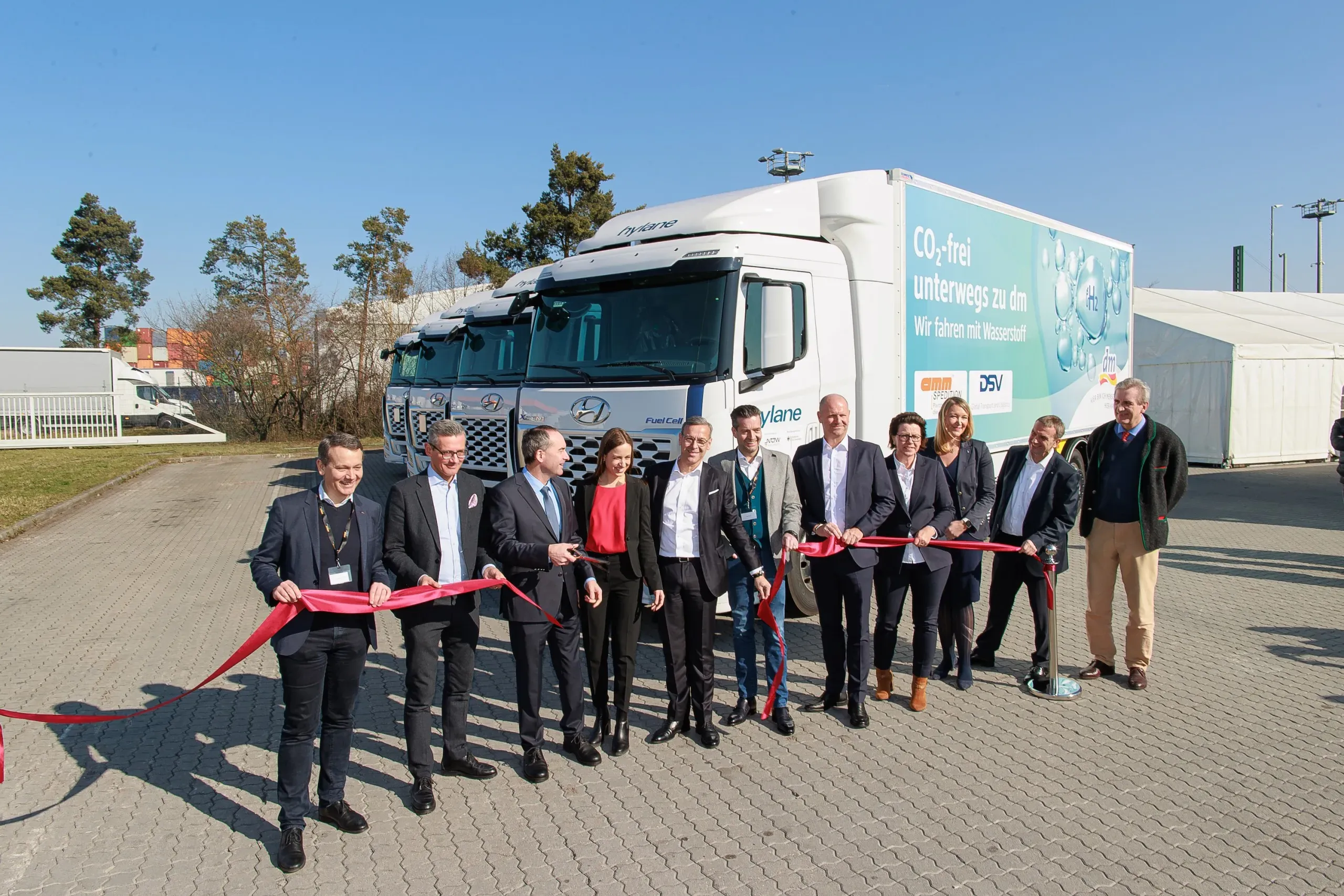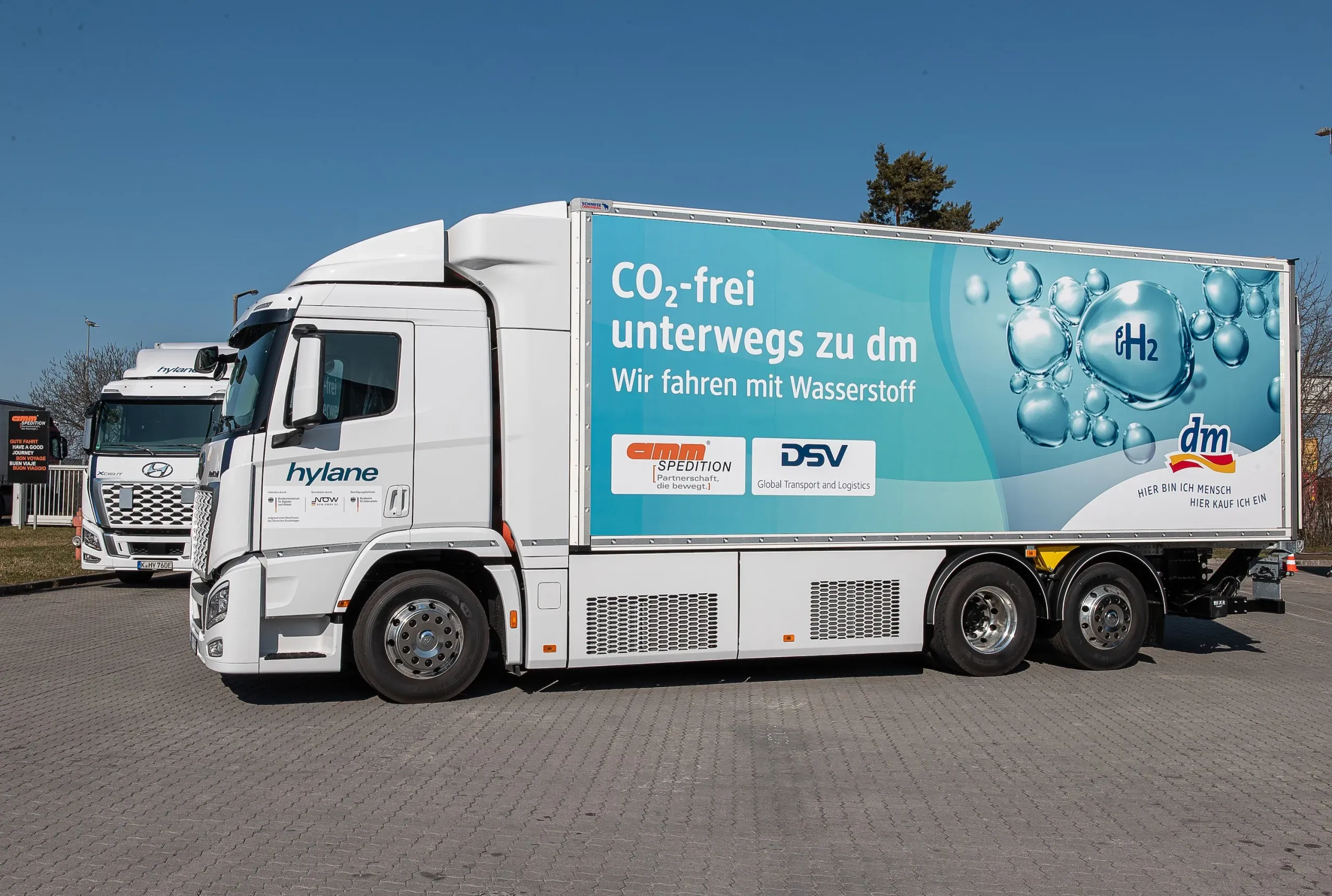 Die Lkw vom Typ „XCIENT Fuel Cell“ von Hersteller Hyundai ermöglichen vor Ort einen nachhaltigeren Warentransport auf der Straße. Vom Verzicht auf fossile Kraftstoffe profitiert nicht nur das Klima, sondern durch wegfallende Emissionen auch die direkte Umwelt. Die Betankung erfolgt über eine Wasserstofftankstelle von H2-MOBILITY in Erlangen. Das Besondere: Das Gas wird in Teilen mit Hilfe der sogenannten LOHC-Methode klimaneutral und lokal produziert. Neben der, für dm fahrenden, Spedition Amm gehören bereits Unternehmen wie DB Schenker, Hermes, Henkel, Spedition Koch sowie Wego Systembaustoffe und mitea zu den hylane-Kunden.