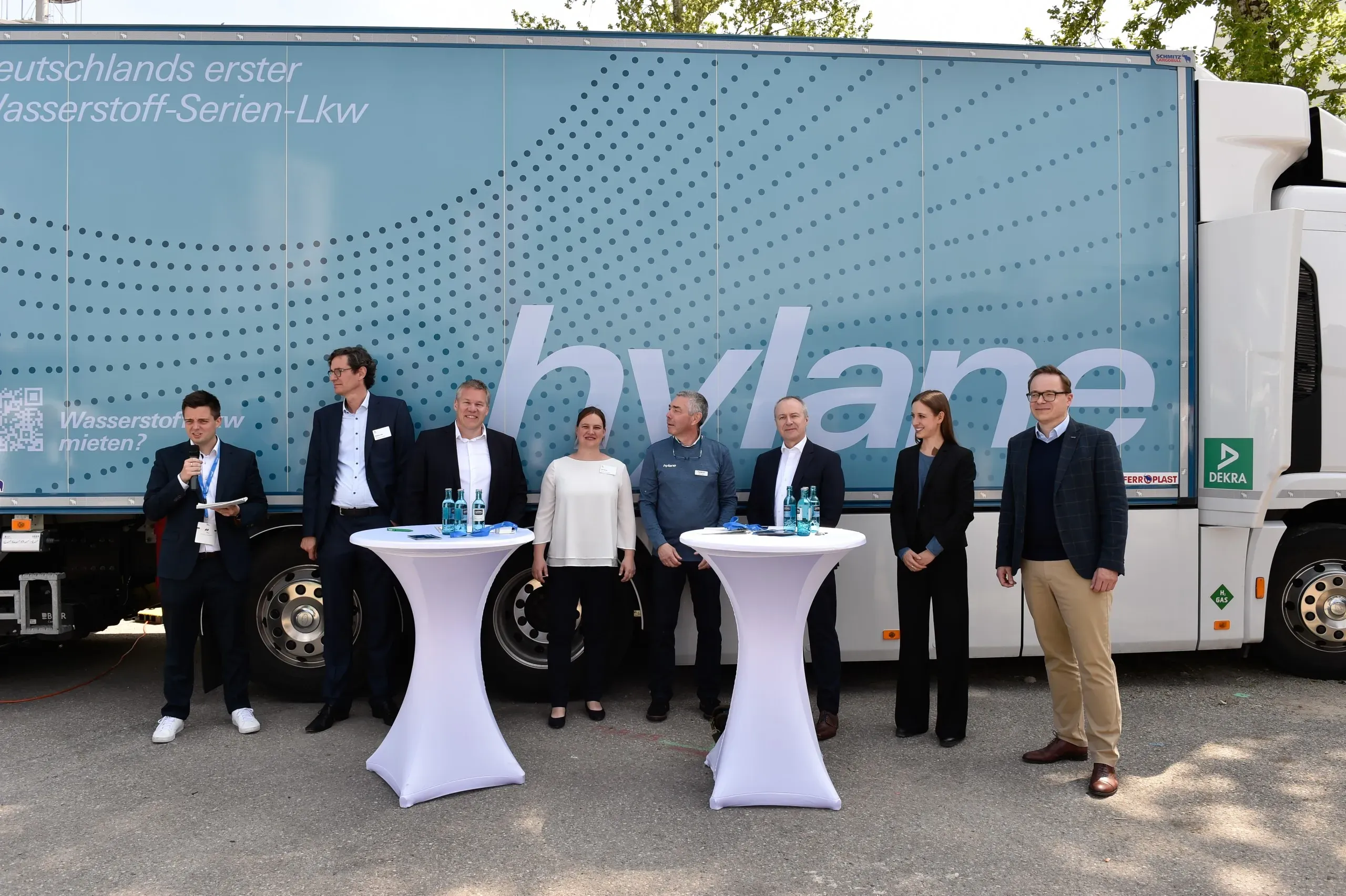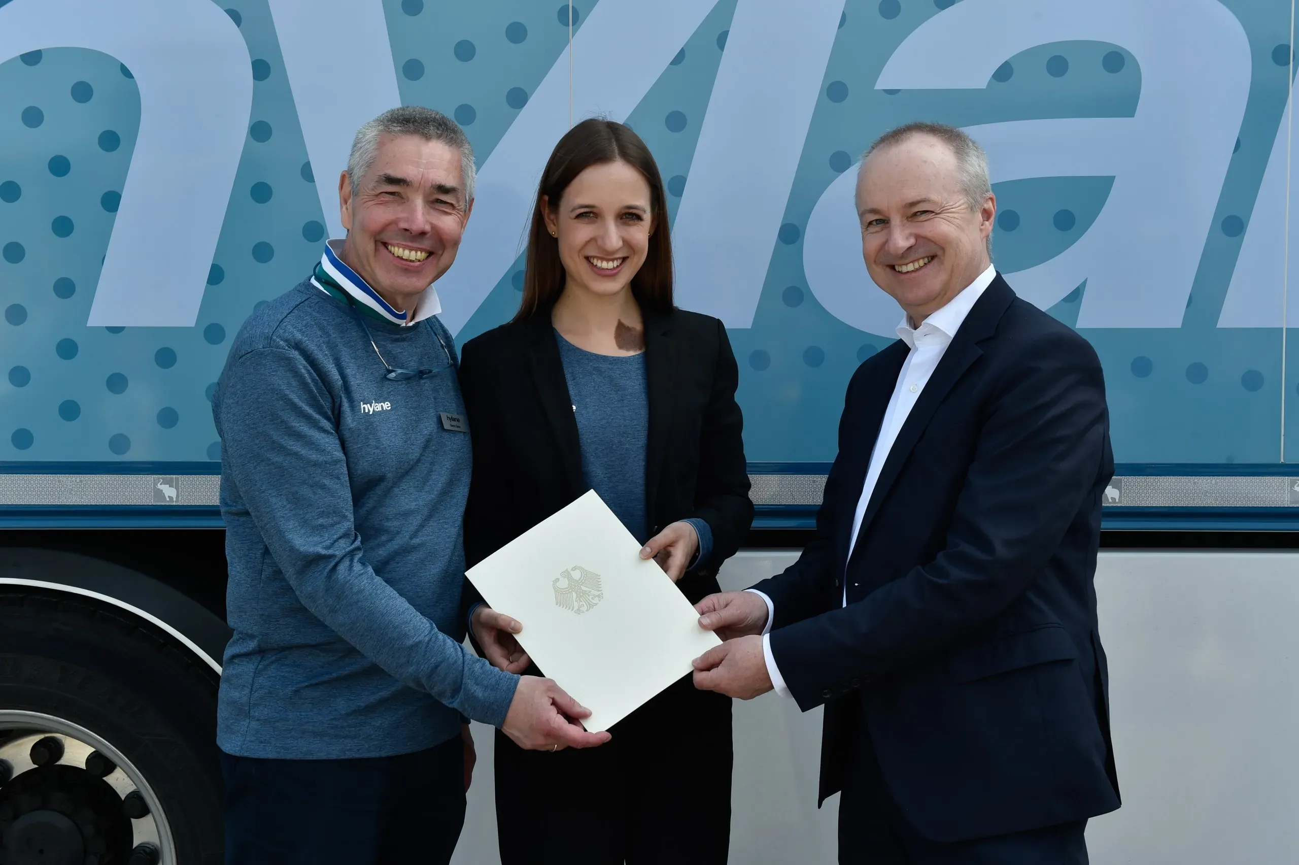 Ministerialdirigent Johannes Wieczorek übergab den Förderbescheid in Höhe von 25 Millionen Euro am 9. Mai auf der Messe transport logistic in München an die hylane-Geschäftsführung Sara Schiffer und Bernd Zens. „Um die Klimaziele zu erreichen, müssen die CO2-Emissionen im Verkehr deutlich gesenkt werden“, so Wieczorek. „Wir freuen uns sehr, hylane auf dem Weg zu nachhaltigem Straßengüterverkehr zu unterstützen.“